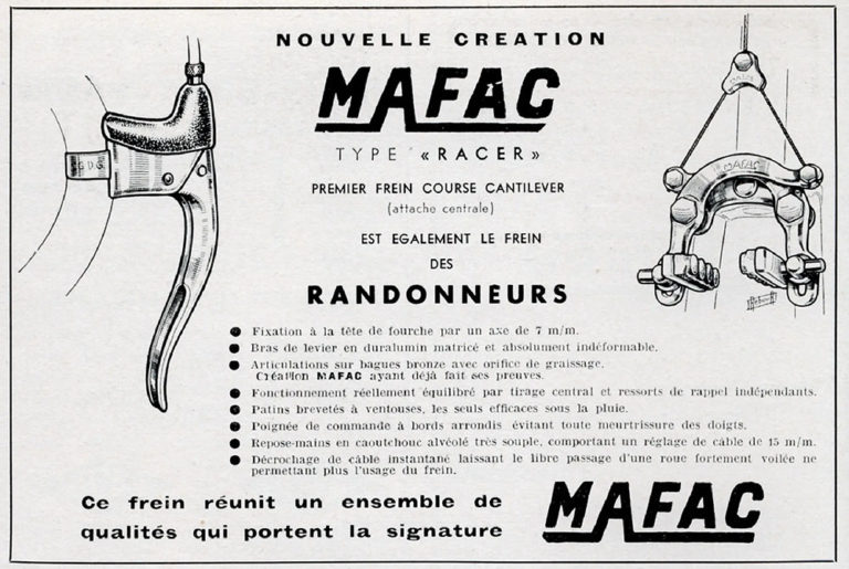 Founded in the city and commune of Clermont-Ferrand in post-war France, the company transcended basic manufacturing to deliver elegance, versatility and sheer stopping power to burgeoning cyclists when they needed it most: while going too fast, often down steep mountain grades on rickety old bikes overloaded with luggage or goods. Indeed, some cycling historians proclaim MAFAC produced, “the first brakes that actually worked.” And worked they did, with the company’s racy Top-63 model tested at 60 m.p.h. under load, as proclaimed in a bold advertisement from 1964.